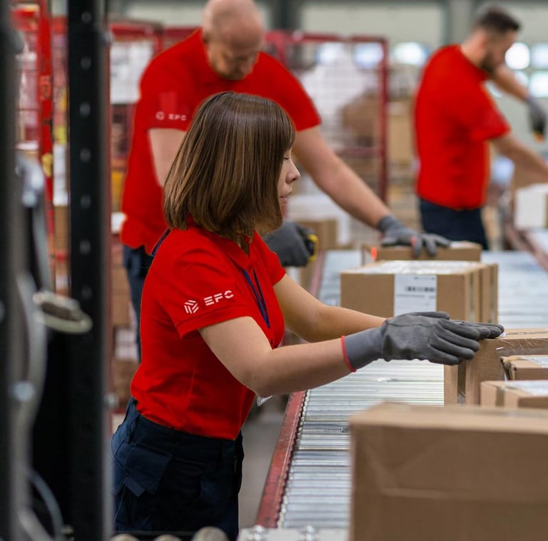 Фулфилмент услуги за е-продавници, вклучувајќи складирање, пакување истиот ден, управување со серии и брза обработка на неиспорачани и вратени пакети.